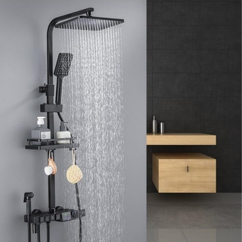Juego de ducha de acero inoxidable cromado al por mayor con estante para productos básicos Juego de ducha de lluvia para baño de montaje en pared